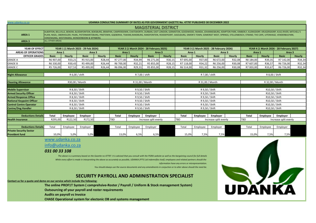 Udanka is affay with the sectoral determination 6 as well as the newly formed Bargaining Council for Security Services.